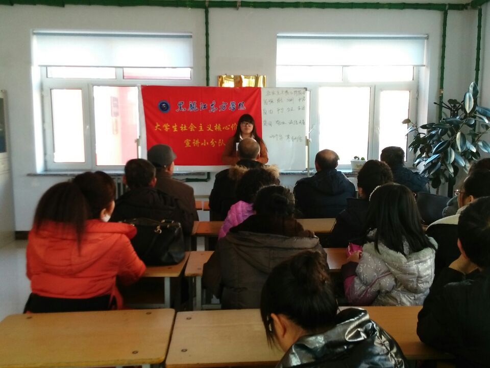 为了培育和践行社会主义核心价值观,引导广大青年学生深入基层开展社会实践和调查研究,2015年寒假期间黑龙江东方学院团委在12000名学生中通过层层选拔,最终选定100名大学生宣讲员,按照家庭所在区域分成20个宣讲小分队,开展社会主义核心价值观宣讲社会实践。院团委选聘了10名教师作为宣讲小分队指导教师,邀请了思政部徐秀娟主任做了专门辅导,为小分队发放了宣讲教材。大学生宣讲员针对不同的宣讲对象,选好角度、把握重点,用事实和数字说话,严谨生动地宣讲社会主义核心价值观。