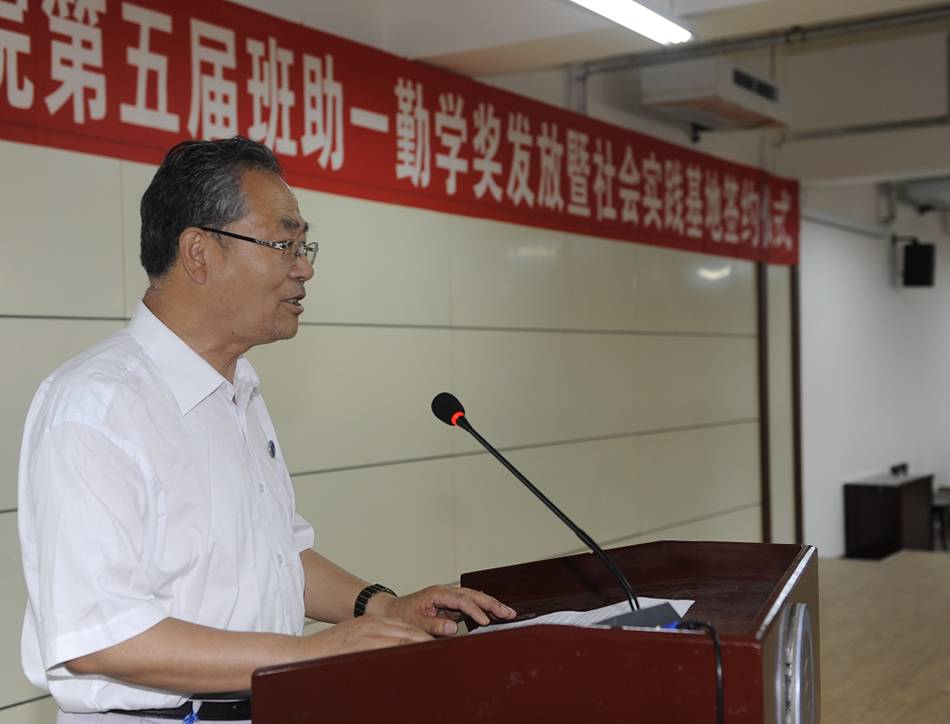 学院副院长左长滨讲话。他指出“班助一”已经走过五年,是我院德育工作一本无声的教材,亲身参与过这项活动的学生接受了实践的教育,感受了公益的洗礼,提升了社会责任感。