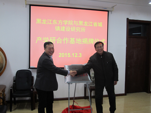 刘德深副院长向黑龙江省城镇建设研究所授予“产学研合作基地”牌匾。会后,与会联盟单位领导参观了新校区。