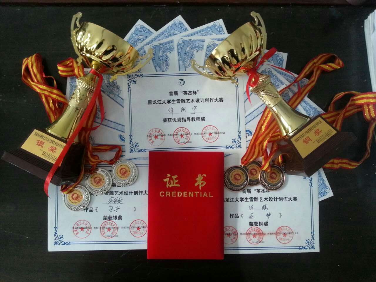 经过5天紧张激烈的角逐,黑龙江省首届“英杰杯”雪雕比赛于1月5日落下帷幕。由我院许翔宇老师带队,2013级环境设计专业的劳安然、邹雨男、王松组成的参赛队伍以作品《蒸汽朋友》荣获银奖。此外外,2015级学生陈鹏、孟兴宇、李伟的参赛作品《逐梦》荣获铜奖。