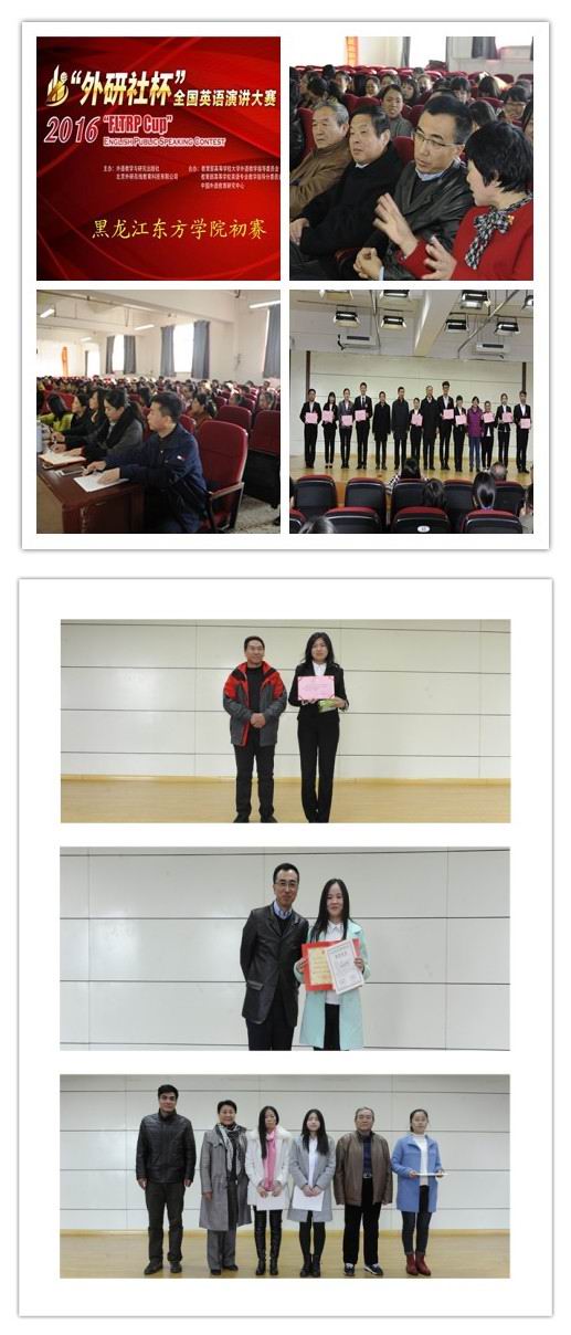 “外研社杯”全国英语演讲大赛是由外语教学与研究出版社联合教育部高等学校大学外语教学指导委员会和教育部高等学校英语专业教学指导分委员会共同举办、面向全国高校在校大学生的公益赛事。大赛自创办以来,在国内外广受关注,已成为全国参赛人数最多、规模最大、水平最高的英语演讲赛事。2013年以来,公共外语教研室已连续四年成功推荐学生参加黑龙江赛区复赛。