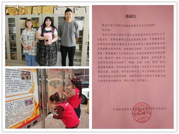 6月4日,一封来自平房区友协街道百利社区的感谢信温暖了外国语学部全体同学的心。而发出感谢信的百里社区党总支书记张亚红的心,也被我院外国语学院团总支师生们两年来的举动温暖着。