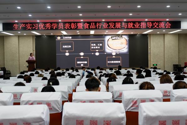 10月17日下午13:30,食品科学与工程专业生产实习优秀学员表彰暨食品行业发展与就业指导交流会在图书馆报告厅举行。王宇、朱悦等2016级食品12名优秀学员从实习单位和学部领导手中接过了优秀实习证明。这一张小小的证明书中,凝结着他们在麦肯食品(哈尔滨)有限公司一个多月内付出的辛劳与汗水。