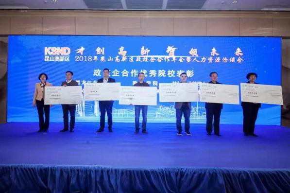 会议对长期以来给予昆山市高新区政校企合作大力支持的院校予以表彰。我院被授予“政校企合作优秀院校”,并给予10万元奖励。
