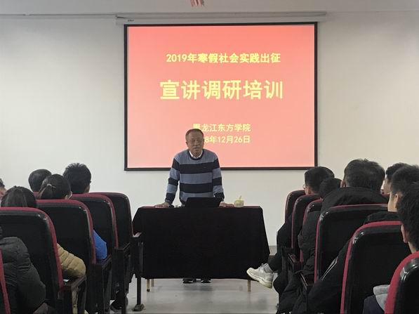 12月26日15:00,由院团委联合学务处、教务处、思想政治理论教研部共同组织开展的2019年寒假社会实践出征仪式暨专题培训在活动中心204举行。思政教研部主任杨彬,学务处副处长、团委书记肖立东参加出征仪式并向实践小分队授旗。各学部团总支书记、宣讲小分队成员代表80余人参加了此次活动,出征仪式由团委副书记张程主持。