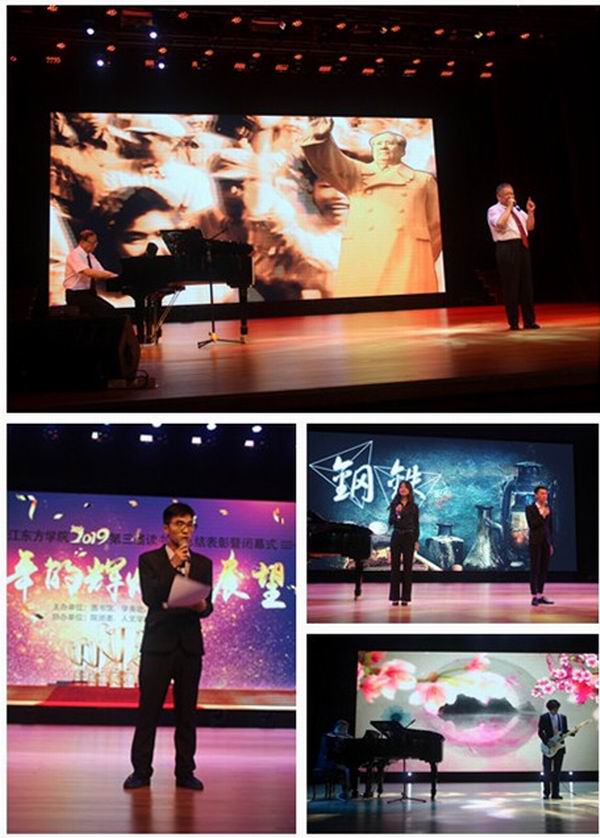 此次活动还特别邀请陈光副院长和曲子光教授合作演绎了作品《人民万岁》,陈光副院长慷慨激昂的朗诵与曲子光教授时而悠扬时而顿挫的琴音,获得在场师生的热情喝彩。随后,获奖学生代表胡婷婷、数字出版公司代表马群、优秀阅读推广人王玥分别发表了感言。
