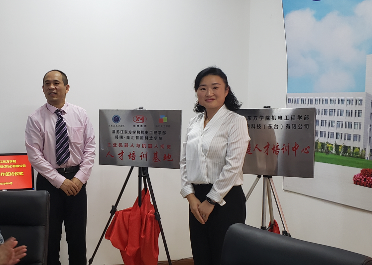 蔡柏岩副院长和王明军董事长签署共建协议,并共同为智能制造人才培训中心揭牌。