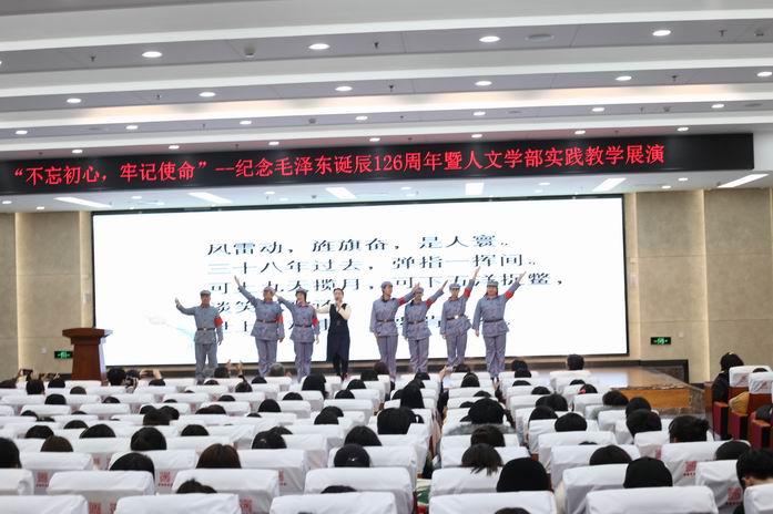 2019年12月18日下午,由人文社会科学学部主办,图书馆、思想政治理论教研部合办的“不忘初心,牢记使命”——纪念毛泽东诞辰126周年暨人文学部实践教学展演活动,在图书馆报告厅举行。