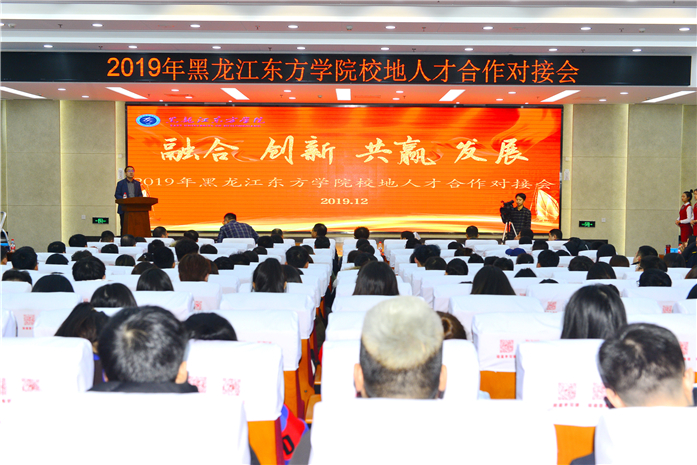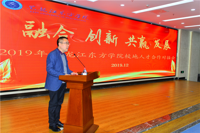 2019年12月27日下午, 黑龙江东方学院校地人才合作对接会在图书馆报告厅举行。副院长蔡柏岩、韩丽霞出席会议,浙江省、江苏省、山东省部分市地、区人力资源管理部门及人才市场负责同志近20人受邀参加。我院教务处、各学部主要负责人,以及部分师生代表参加了会议,会议由招生就业工作处处长陈树一主持。