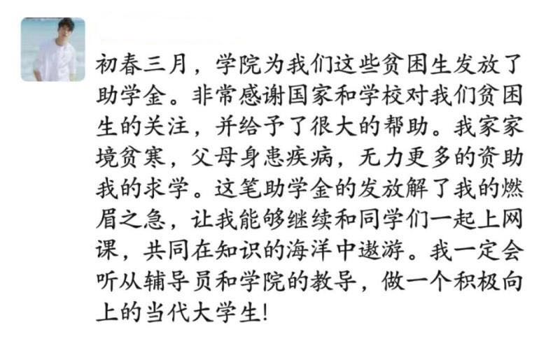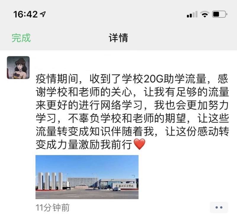 一项项暖心之举,解决了同学们学习、生活的后顾之忧,纷纷表示,“疫情无情,学校有爱,在线上教学特殊时期,学校发放的学习网络流量补助真是暖心助学,帮助我们及时解决线上教学网络拥堵和流量问题,倍感学校的人文关怀和浓浓情意,更加坚定宅家上好网络课程的信心,一定不辜负学校老师们的期望,认真完成线上学习任务,提高网络学习质量效果,以更好的成绩回报学校、社会、国家。”
