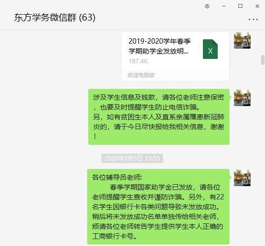 辅导员老师通过微信群、短信等多种渠道提醒大家疫情防控注意事项,把资助工作真正做到学生心坎里。
