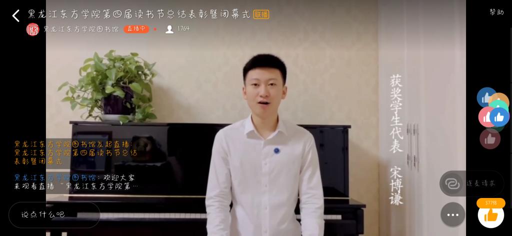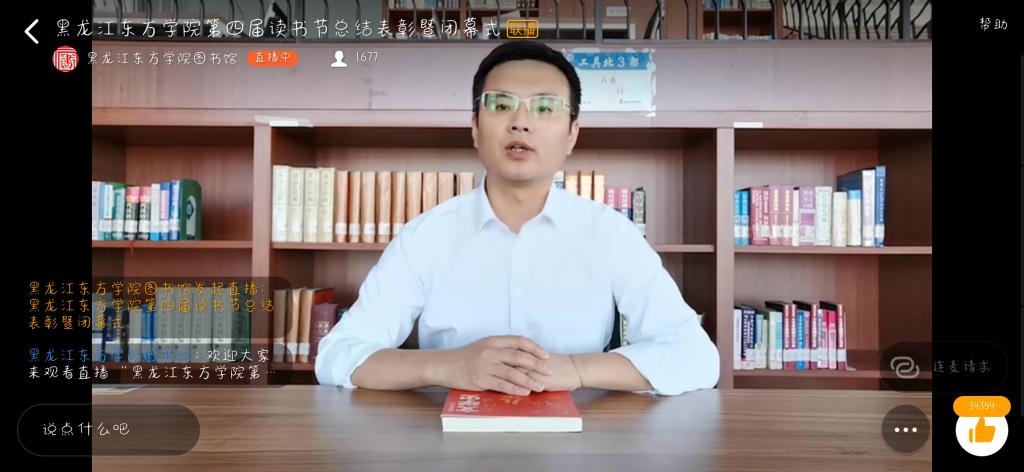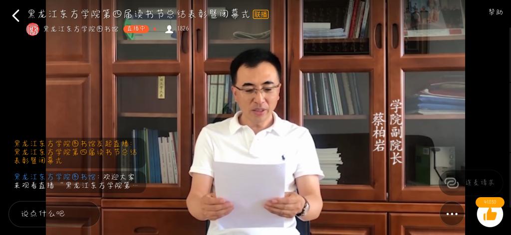7月5日,黑龙江东方学院第四届读书节总结表彰暨闭幕式,以钉钉线上直播的形式,圆满落幕。学院副院长、党委副书记李世泽,副院长蔡柏岩出席,图书馆、学务处、教务处、人文学部、思政教研部学部负责人,以及中国知网、北京超星集团、博看期刊数据公司,图书馆全体馆员及各学部师生代表两千余人参加了此次线上闭幕式。闭幕式由图书馆副馆长张红岩主持。