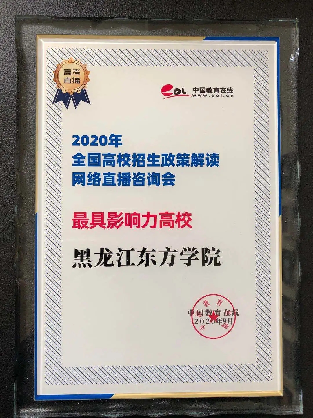 2020年招生期间,中国教育在线举办了“2020年高考招生网络咨询会”系列直播活动,我院在中国教育在线开展的评选活动中,获得招生宣传"最具影响力高校"殊荣。本次评选以院校直播间获得的播放量、观众数与互动总量,以及院校参与的直播场次为依据进行综合考量而得出。