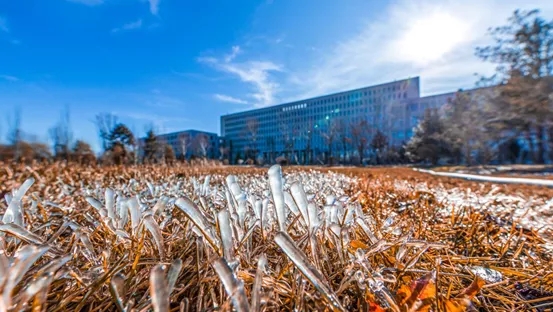 图一:冰雪初融的春光照耀大地,地上的冰折射的光与天空交相呼应,象征一种希望和新生,突出新生向阳的感觉;图一没有用常规的建筑拍摄手法(小光圈全景深),相反采用了侧逆光低机位大光圈拍摄,用明亮的自然光突出前景冰柱的晶莹剔透,大型建筑虚化做背景,而且建筑与地面色彩正好形成冷暖对比,一束镜头炫光又恰好起到了视觉引导作用。