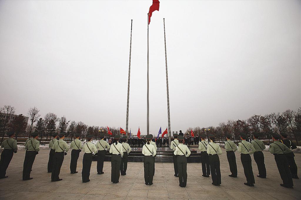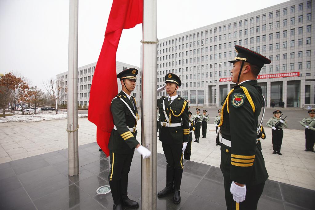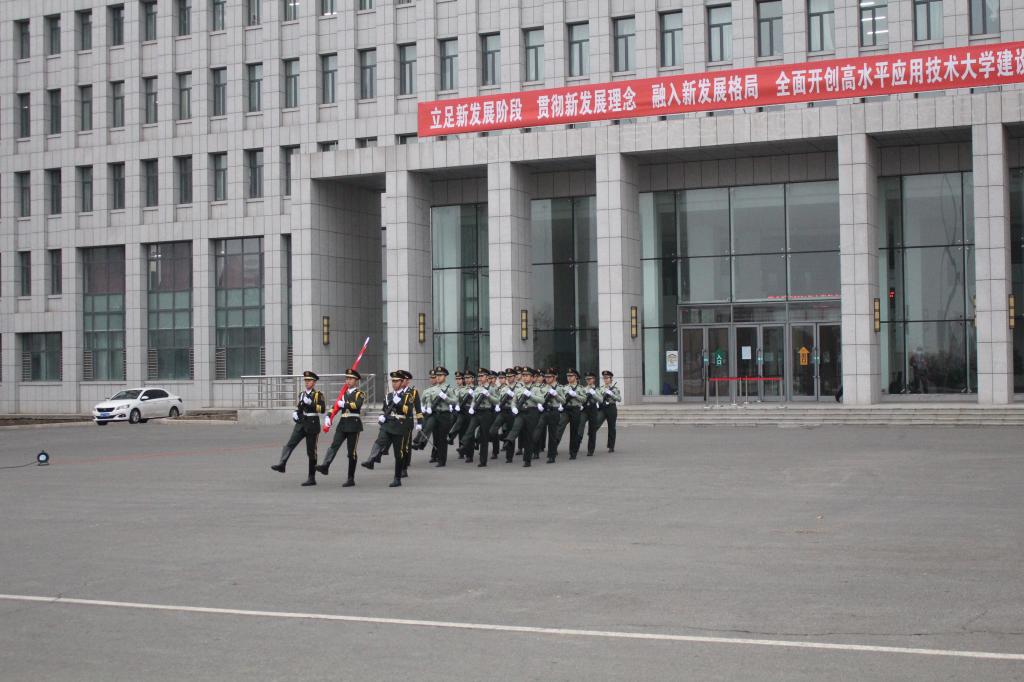 在雄壮的国歌声中,五星红旗冉冉升起,现场师生庄严肃立,行注目礼。