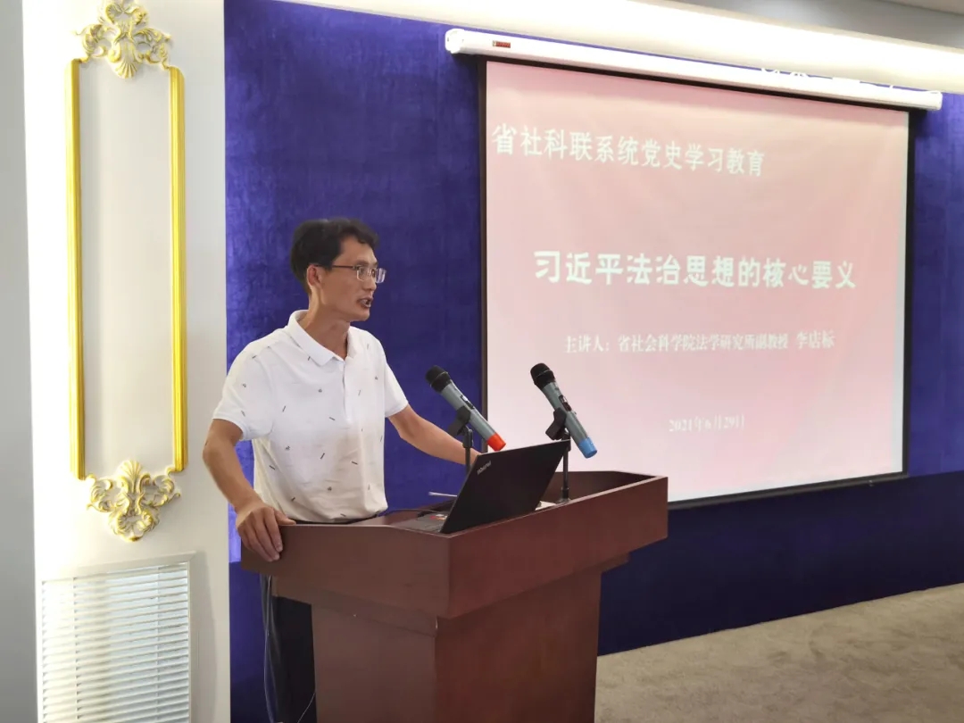 副校长、东方学院社科联副主席蔡柏岩教授介绍了学校的办学情况、学校社科联的工作情况及党史学习教育情况。随后,省社会科学院法学研究所副教授李店标以《习近平法治思想的核心要义》为题作党史学习教育专题宣讲。