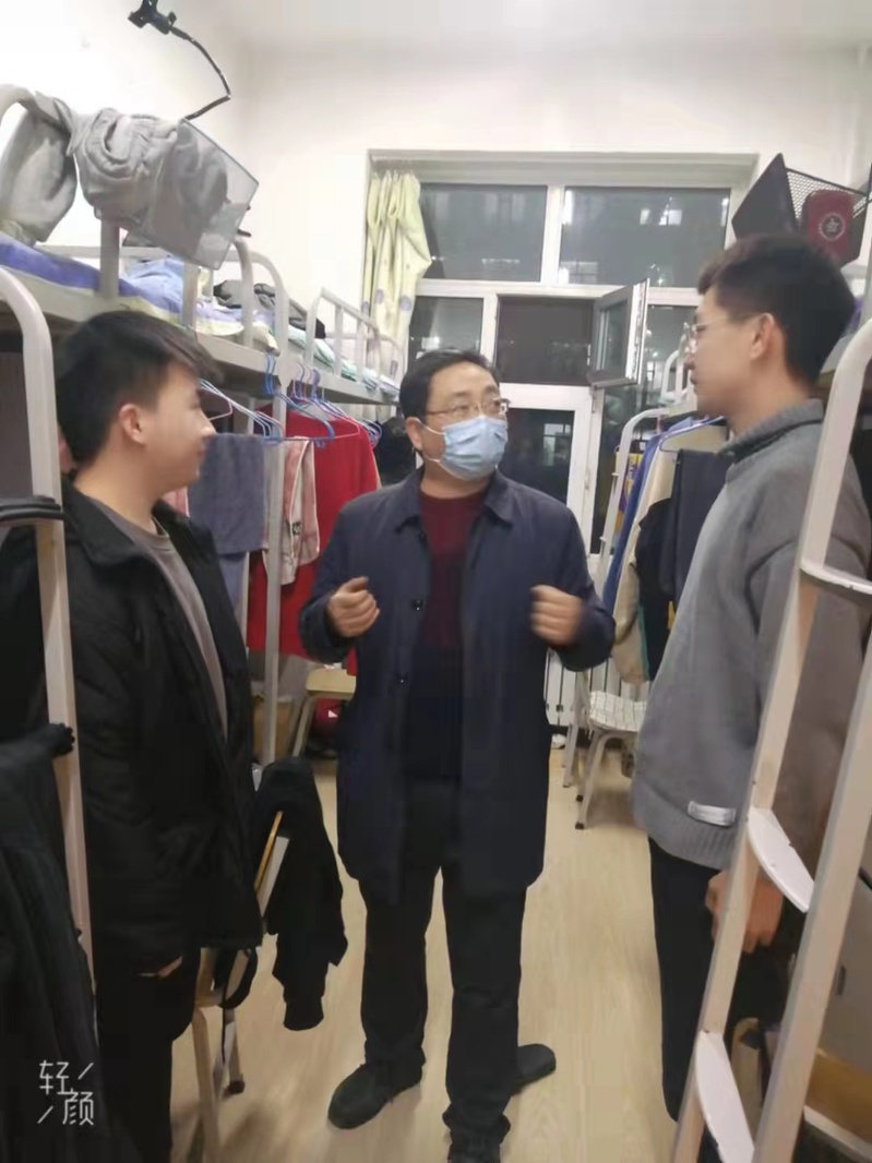 “别害怕,咱们学校肯定会保护好大家的安全!”“一定遵守学校的相关规定,戴好口罩,别聚集,别跳栅栏!”每到一个寝室,党总支书记王成全总要不厌其烦的叮嘱几句、鼓励几句,遇到吸烟的学生,王成全严肃但不失和蔼地批评阻止,同学们既怕他又尊敬他。