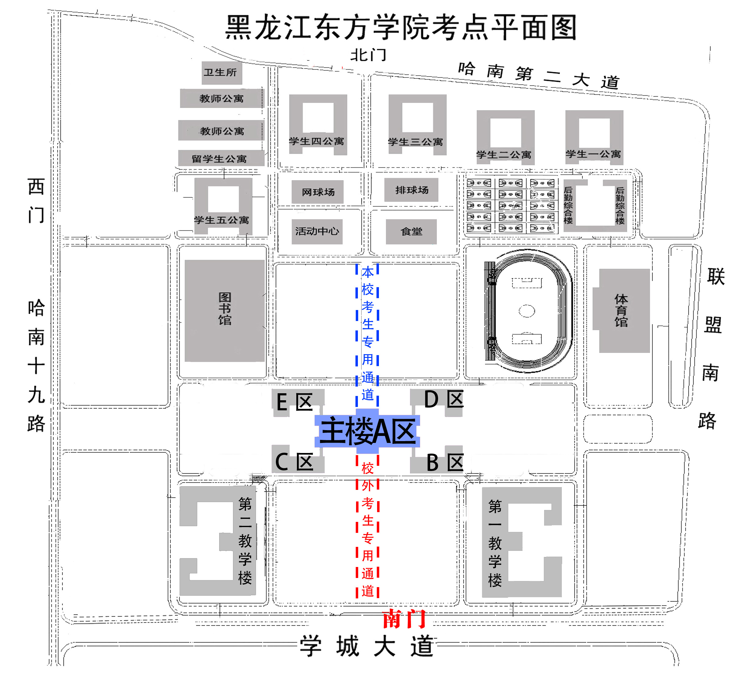 校外考生应提前熟悉考点,每场考试要预留足够的时间,提前到达考点。考试当日我考点仅对校外考生开放学校南门(学城大道方向)。校外考生在校门口接受相关检查,出示上述提及的五项须查验材料,扫描出示“龙江健康码”和“通信大数据行程卡”后步行入校。考试地点在学校主楼(考点平面图见附件3),主楼门口经体温检测合格后,方可进入考场。社会送考车辆禁止进入校园。