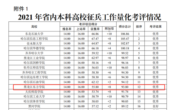 近日,由黑龙江省人民政府征兵办公室和黑龙江省教育厅联合开展的2021年黑龙江省普通高等学校征兵工作量化考评中,我校被评为“优秀”等次。我校将征兵纳入学院学生工作考核评价体系的做法受到上级单位表扬。