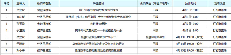 据了解,系列讲座共分为7个主题,于4月5日-15日期间面向全校学生通过钉钉群进行直播。