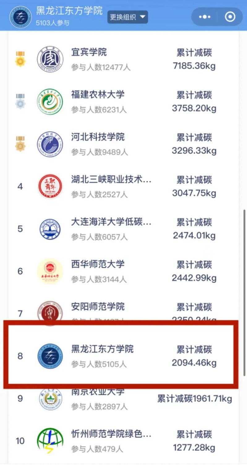 2022年全国节能宣传周定于6月13日至19日举办。共青团中央联合中国光华科技基金会发起了全国百所高校“美丽中国﹒青春行动”校园绿色低碳周活动。我校作为黑龙江省3所试点高校之一参与此次活动。根据活动平台统计,截至目前,我校累计减碳量达2094.46kg,位列全国百所高校排行榜第八名、全省三所试点高校排行榜第一名。