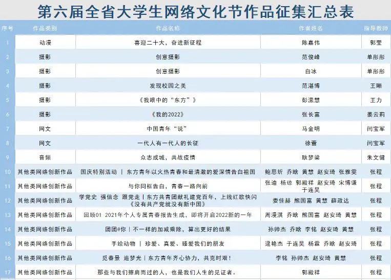 近日,由省委教育工委、省委网信办主办的第六届全省大学生网络文化节评选结果揭晓,我校选送的网络文化作品共获奖项17项,其中省级一等奖1项,省级二等奖6项,省级三等奖10项。