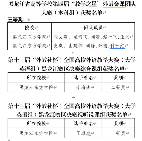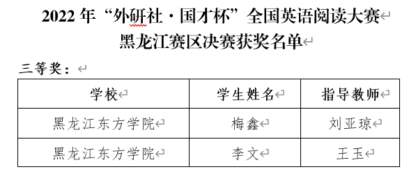近日,黑龙江省教育厅公布了2022年全国普通高等学校系列外语大赛国赛和省赛获奖结果。在“外研社·国才杯”全国英语演讲、写作、阅读大赛、“教学之星”外语金课团队大赛省赛、第十三届“外教社杯”全国高校外语教学大赛省赛(大学英语组)中,全省各高校299名学生、196名教师获得个人奖和优秀组织奖。