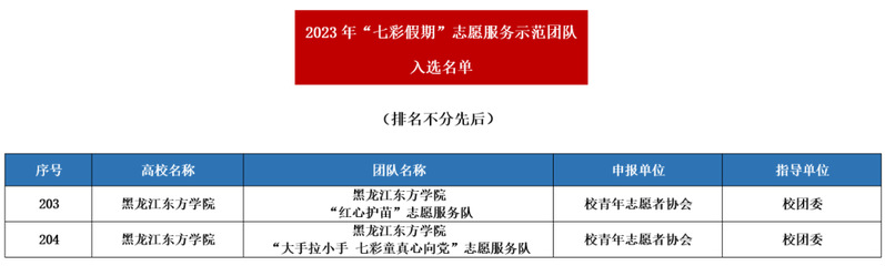 为深入学习宣传贯彻习近平新时代中国特色社会主义思想和党的二十大精神,引导动员青年学生加强对少年儿童群体的关心关爱,2023年4月下旬,团中央青年志愿者行动指导中心、中国青年志愿者协会秘书处面向全国高校发布了《关于遴选2023年“七彩假期”志愿服务示范团队的公告》。截至6月2日,全国共3762支志愿服务团队提交了申报材料,最终遴选了1000支团队。其中我校“红心护苗”志愿服务队和“大手拉小手 七彩童真心向党”志愿服务队成功入选!