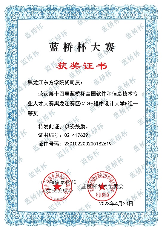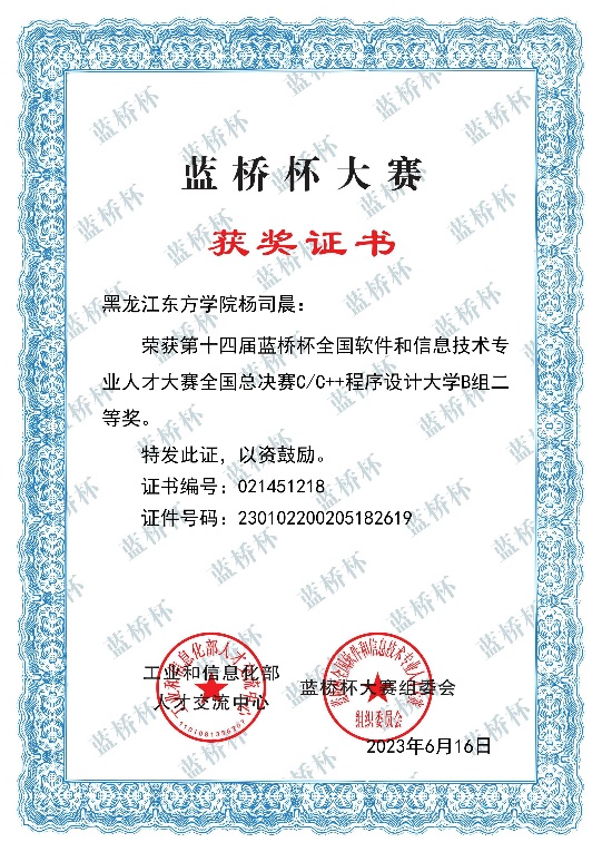 杨司辰 | C/C++程序设计大学 B 组 | 二等奖 | 吕莹楠 |