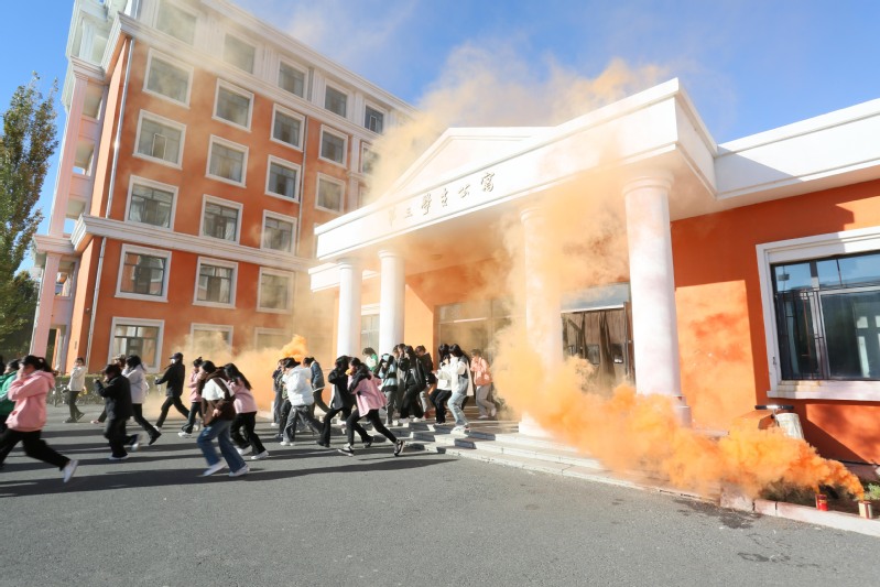 随着浓烟从学生第三公寓门口冒出,本次消防演练正式开始。火警铃声响起后,立即启动消防疏散预案,全体在寝学生迅速做出反应,低姿弯腰疏散,按专人指引安全有序的快速疏散,迅速撤离到轮滑场安全地带。
