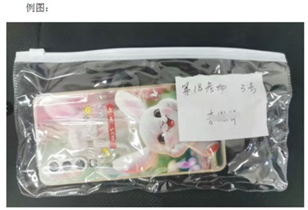 考生不得将手机带入考点(考试封闭管理区域)。如有特殊情况考生手机需在考试封闭管理区域外委托放置,须用小型文具袋或信封自行将手机包裹,作上记号(考场号和座位号),如例图。考试结束后凭准考证和考点发放的寄存凭证领取。