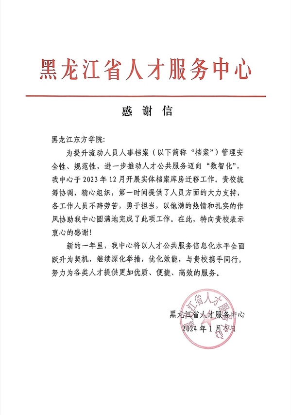 近日,我校收到黑龙江省人才服务中心发来的感谢信,对我校在该中心档案库房搬迁期间提供的支持表示感谢。