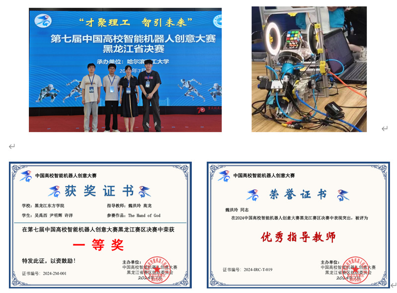 7月14日,第七届中国高校智能机器人创意大赛黑龙江赛区决赛在哈尔滨理工大学举行,我校学生吴禹西、尹明辉、许洋喜获主题二创意竞技赛道(挑战更快魔方机器人)一等奖,指导教师魏洪玲获得优秀指导教师称号。