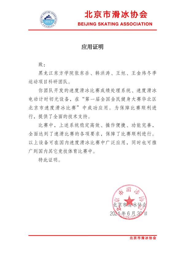 由我校信息工程学院张东岳、韩洪涛等几位老师研发的速度滑冰比赛成绩处理系统、速度滑冰电动计时切光设备,在“第一届全国全民健身大赛华北区北京市速度滑冰比赛”中成功应用。受到北京市滑冰协会的高度赞扬及充分肯定。这也是继北京冬奥会、亚洲短道速滑公开大奖赛等重大赛事之后,再一次得到应用。