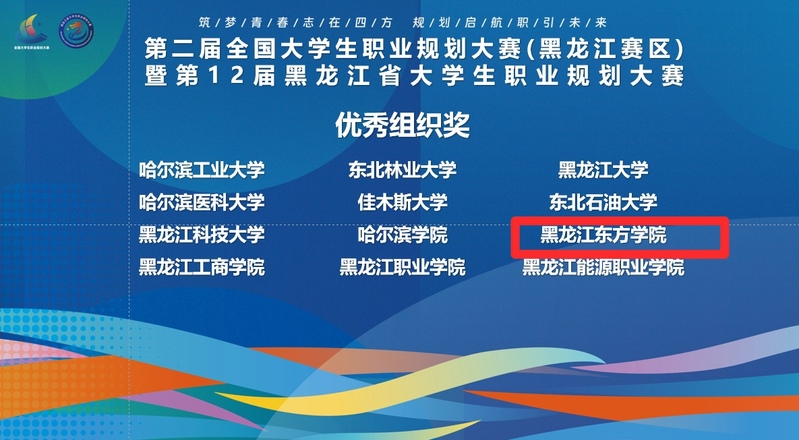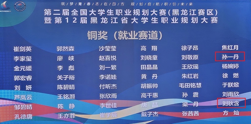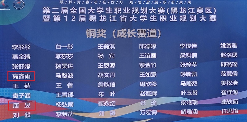3月7日,第二届全国大学生职业规划大赛(黑龙江赛区)暨第12届黑龙江省大学生职业规划大赛在哈尔滨学院圆满落幕, 我校两名参赛选手获成长赛道铜奖;两名参赛选手获就业赛道铜奖;我校获优秀组织奖。