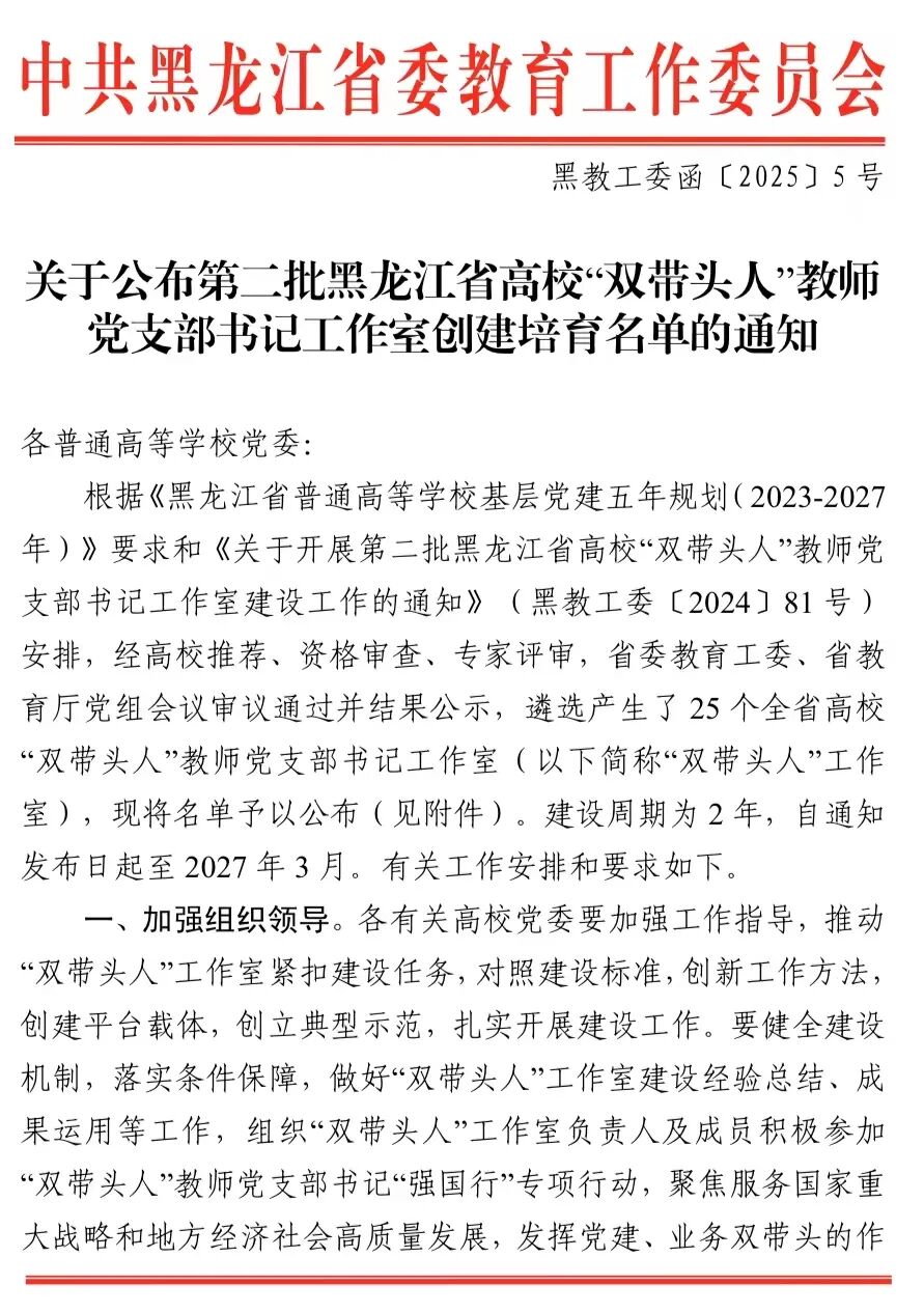 下一步,学校党委将认真落实《黑龙江省普通高等学校基层党建五年规划(2023-2027年)》和上级党建示范创建有关要求,紧扣党委“六个过硬”、院系党组织“五个到位”和基层党支部“七个有力”要求,强化过程管理、健全建设机制、落实条件保障,分层分类推进标杆院系、样板支部、“双带头人”教师党支部书记工作室的创建培育,指导建设单位对标重点任务指南,创新工作方法,形成特色亮点,打造工作品牌, 发挥辐射引领作用,不断推动党建与业务工作深度融合,以高质量党建推动学校事业高质量发展,为龙江高质量发展、可持续振兴作出新的贡献。(组织部 供稿)
