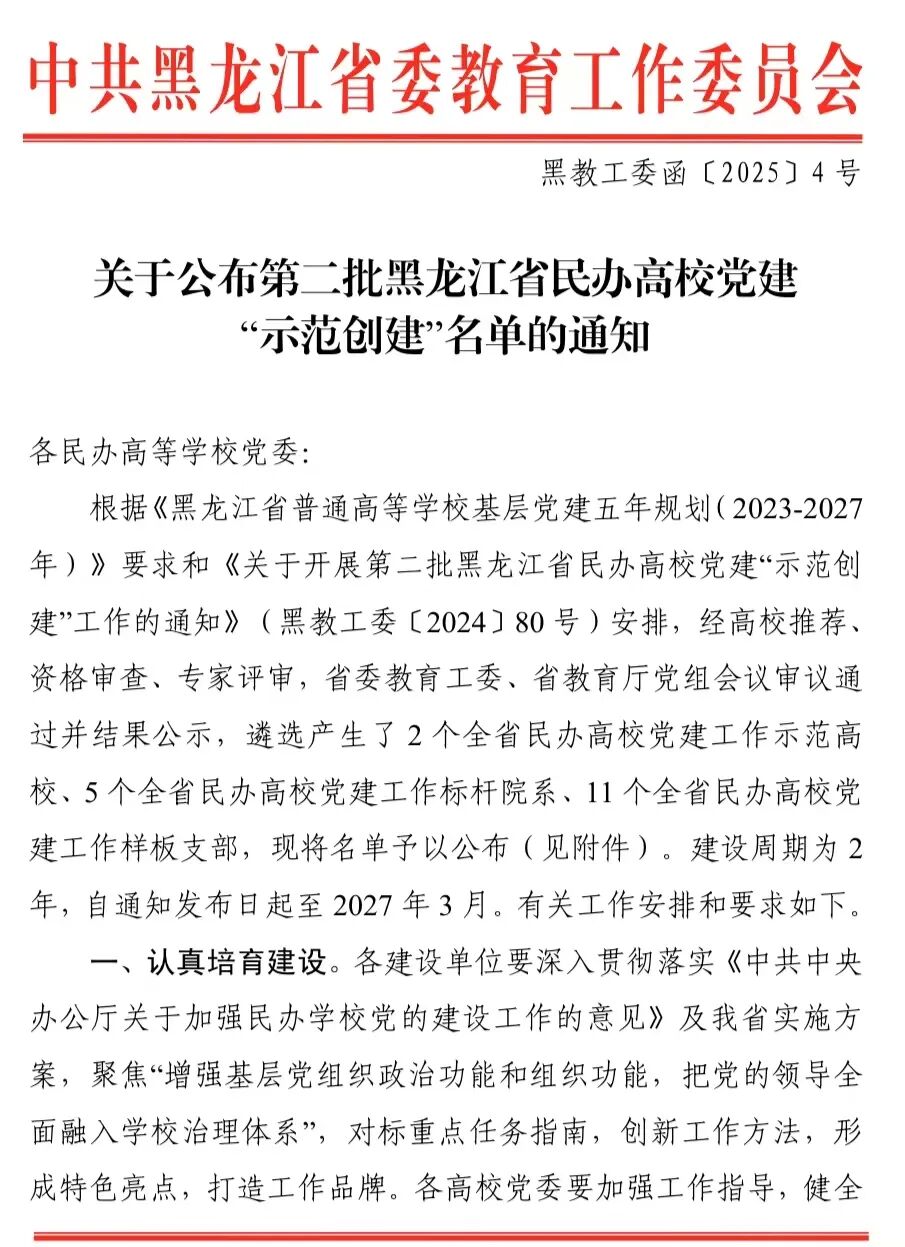 近年来,我校党委深入学习贯彻习近平总书记关于党的建设的重要思想,贯彻落实新时代党的建设总要求,深入实施对标创优工程,获批首批全省民办高校党建工作示范高校和1个党建工作标杆院系、3个党建工作样板支部、1个“黑龙江省高校‘双带头人’教师党支部书记工作室,2个党组织获批全省基层党建示范点,1个教师党支部入选第四批“全国党建工作样板支部”创建培育单位,3个教师党支部入选全省高校“双带头人”教师党支部书记“强国行”专项行动,党建示范创建工作取得显著成效。