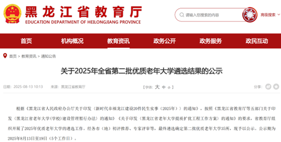 8月13日,黑龙江省教育厅公布“关于2025年全省第二批优质老年大学遴选结果的公示”,由学校自主申报,经各市(地)初评推荐、专家评审等,最终遴选确定第二批优质老年大学35所。黑龙江东方学院东方老年大学顺利通过黑龙江省优质老年大学遴选。这是我校创办老年大学、发展老年教育事业取得的重要成果。这既是对我校为龙江老年教育事业发展做出东方贡献的肯定,也是我校打造“东方老年大学”金色品牌的重要里程碑。