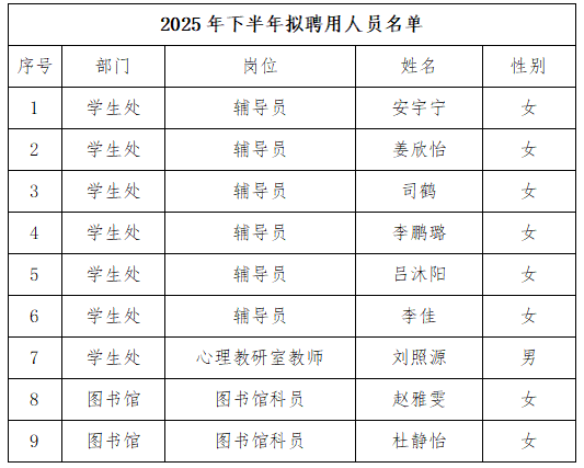 根据《黑龙江东方学院2025年下半年公开招聘公告》的要求,经黑龙江东方学院校长办公会讨论通过,现将拟聘用人员予以公示,公示期为2025年8月22日- 2025年8月28日(5个工作日)。