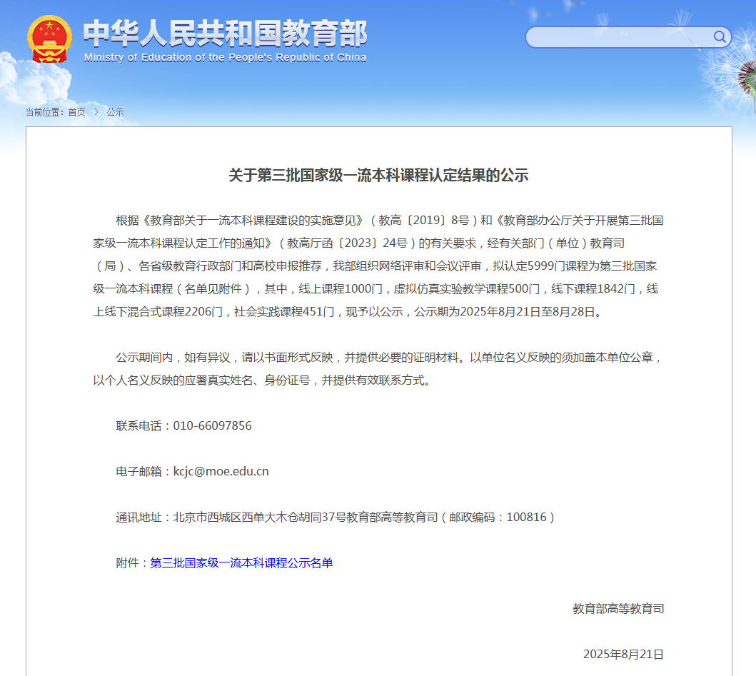 根据《教育部关于一流本科课程建设的实施意见》(教高〔2019〕8号)和《教育部办公厅关于开展第三批国家级一流本科课程认定工作的通知》(教高厅函〔2023〕24号)相关要求,经有关部门(单位)教育司(局)、各省级教育行政部门及高校申报推荐,教育部组织网络评审与会议评审,拟认定5999 门课程为第三批国家级一流本科课程。我校赵海龙教授团队主持的《大学艺术英语(1)》拟认定国家级一流本科课程--“线上线下混合式课程”,实现了我校在国家级一流课程建设中的“零的突破”,标志着我校课程建设与人才培养质量迈上新的台阶。