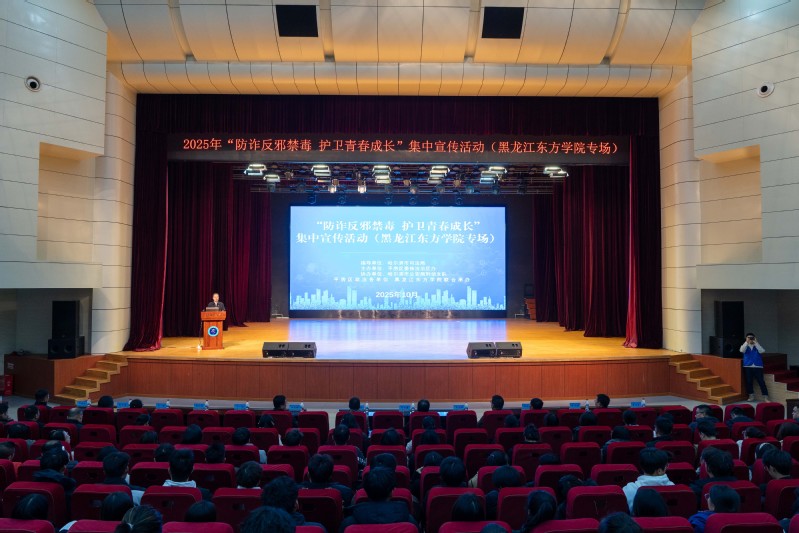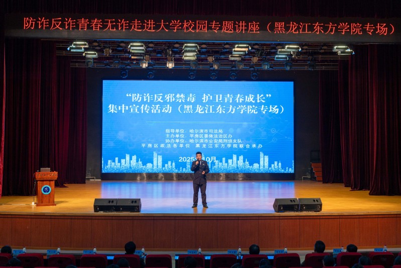 为进一步筑牢校园安全防线,切实提升全体师生防诈、反邪、禁毒意识与自我保护能力,10 月 22 日下午,2025 年“防诈反邪禁毒 护卫青春成长”集中宣传活动(东方学院专场)在黑龙江东方学院养正讲堂举行。本次活动由平房区委依法治区办主办,平房区政法各单位与黑龙江东方学院联合承办,平房区司法局局长、党组书记何志武,我校党委副书记、副校长、纪委书记陈文慧,以及平房区委政法委、区公安分局、区法院、区禁毒大队等政法单位相关负责同志,我校相关职能部门负责人共同出席活动,宣讲环节由学校党委宣传部、统战部部长蔡玉生主持。