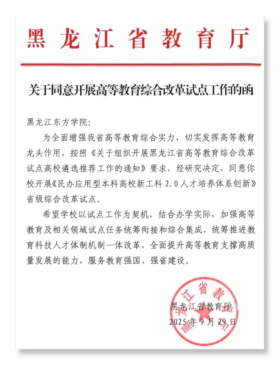 近日,黑龙江省教育厅印发通知,同意我校开展“民办应用型本科高校新工科2.0人才培养体系创新”省级综合改革试点。