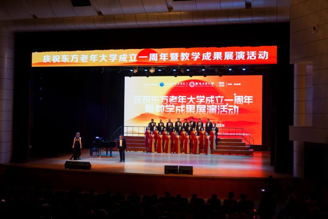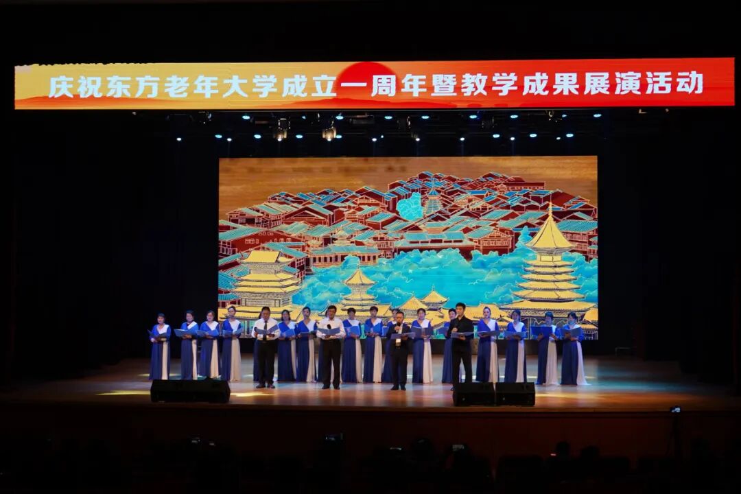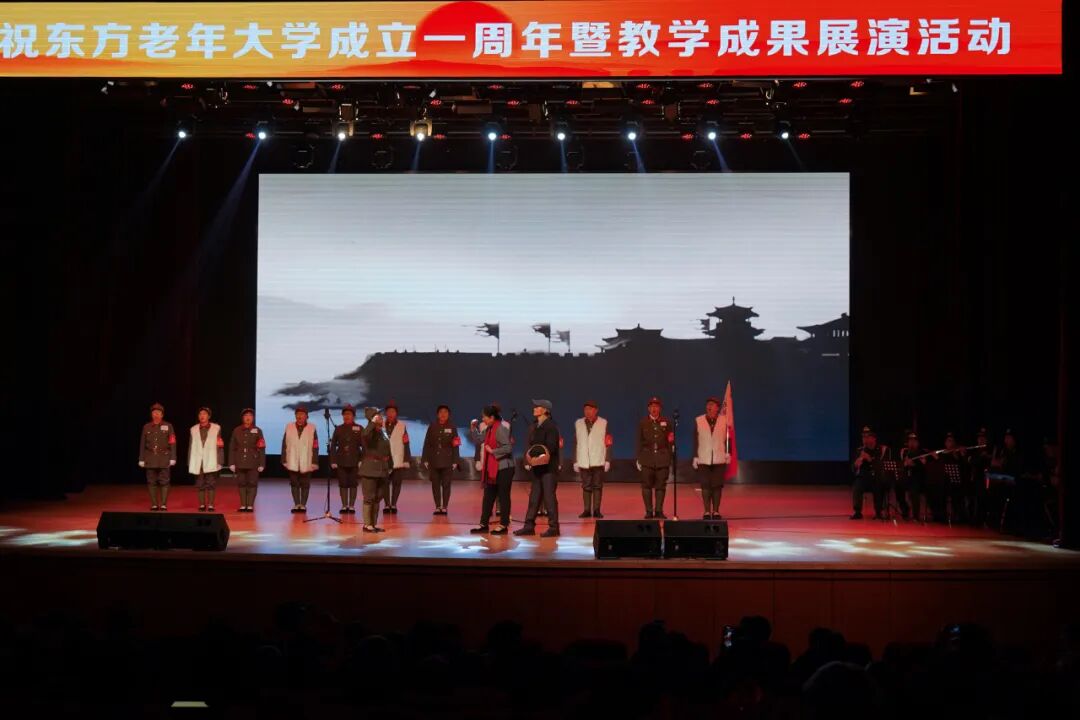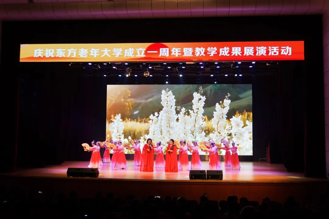开幕式后,庆祝东方老年大学成立一周年暨教学成果汇报演出在养正讲堂举行。东方老年大学爱乐艺术团带来的《红旗颂》作品用雄壮的旋律拉开了展演的帷幕。