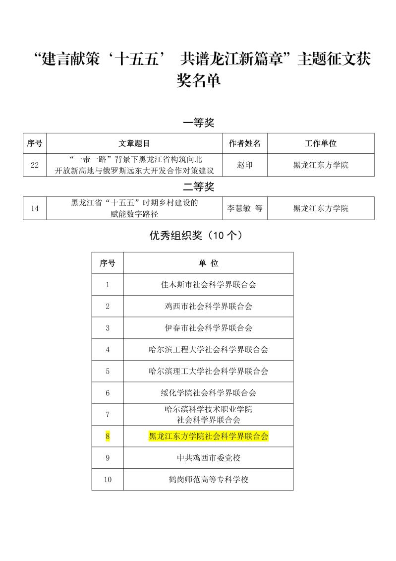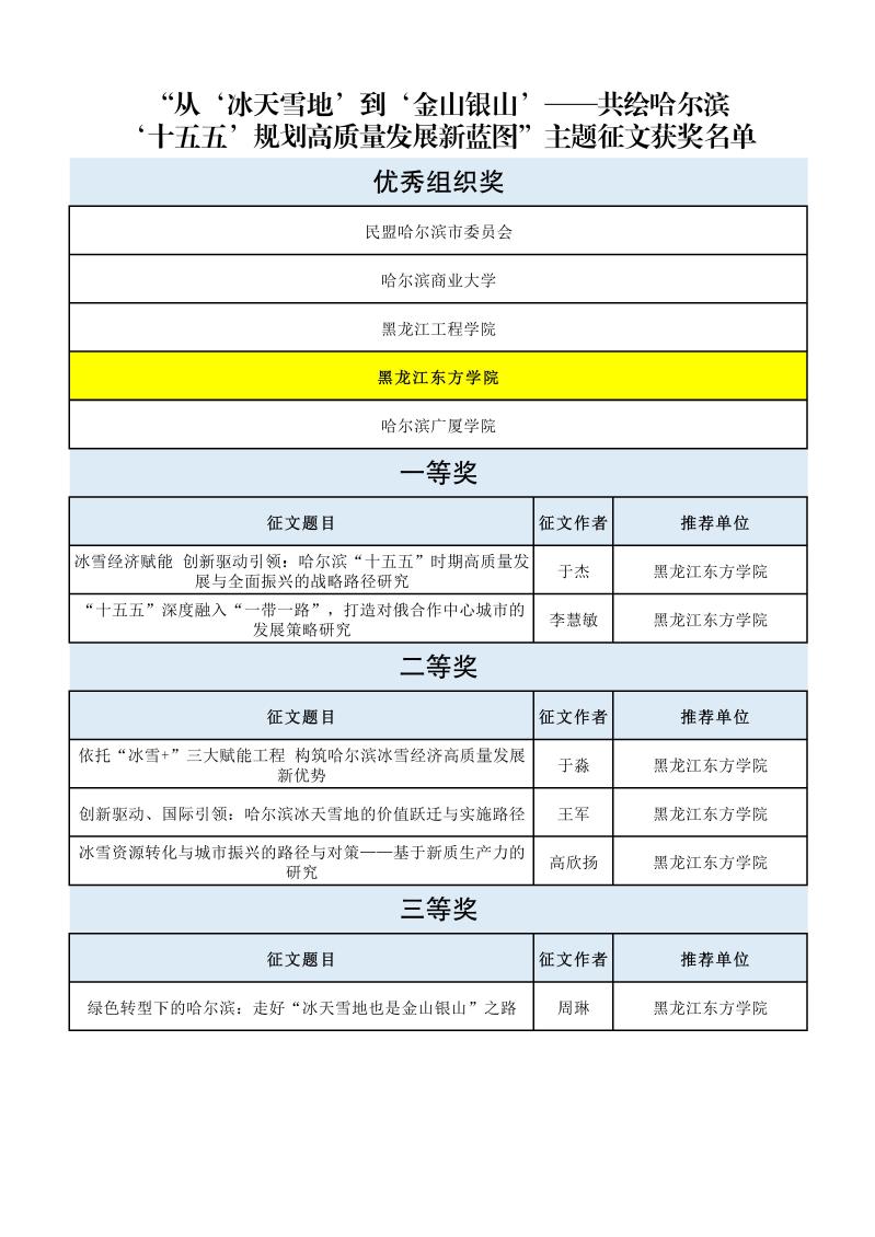 近日,黑龙江省社科联公布《关于公布“建言献策‘十五五’ 共谱龙江新篇章”主题征文获奖名单的通知》、哈尔滨市社科联公布《关于“从‘冰天雪地’到‘金山银山’——共绘哈尔滨市‘十五五’规划高质量发展新蓝图”主题征文获奖名单的通知》,我校在此次省、市主题征文活动中表现优异,充分展现了学校教师的学术水平和创新能力。