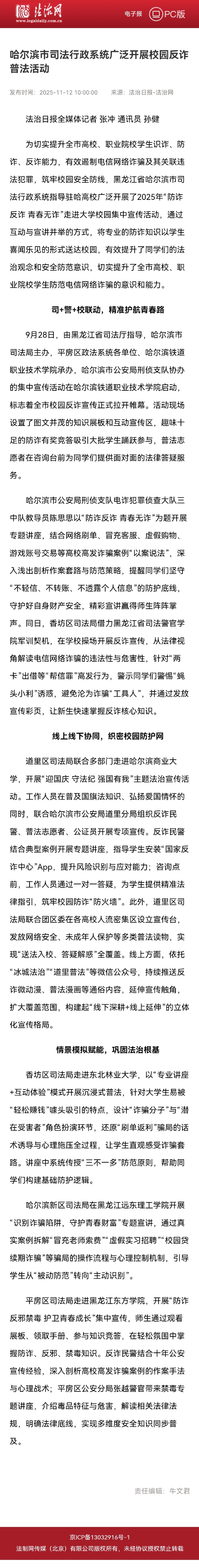 法治网:哈尔滨市司法行政系统广泛开展校院反诈普法活动
