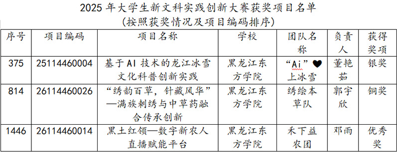 未来,学校将以此次赛事取得的成绩为动力,进一步深化新文科教育教学改革,持续推进“以赛促教、以赛促学、以赛促创”的育人模式,搭建更多跨学科、多元化的创新实践平台。各学院也将继续立足传统文化资源与地方发展需求,鼓励师生聚焦核心议题深耕细作,在文化传承创新、乡村振兴、社会服务等领域持续发力,着力培养更多具有家国情怀、创新精神和实践能力的高素质复合型人才,为推动龙江文化振兴与地方经济社会高质量发展贡献东方力量。(教务处 供稿)