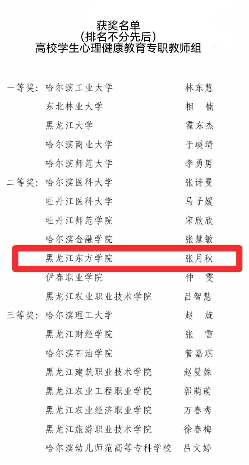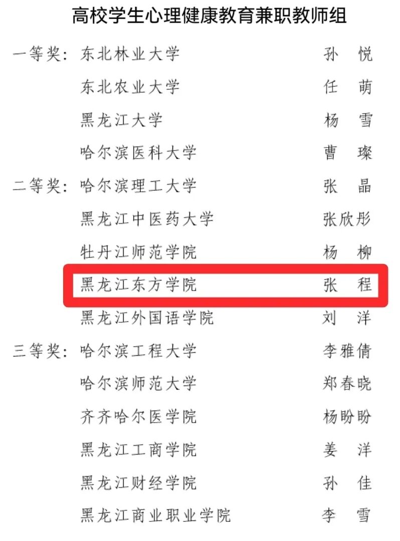 近日,由黑龙江省教育厅、黑龙江省教科文卫体工会委员会联合主办,哈尔滨医科大学承办的首届黑龙江省高校心理健康教育教师教学大赛公布获奖名单。我校专职心理教师张月秋、兼职心理教师张程均荣获二等奖。