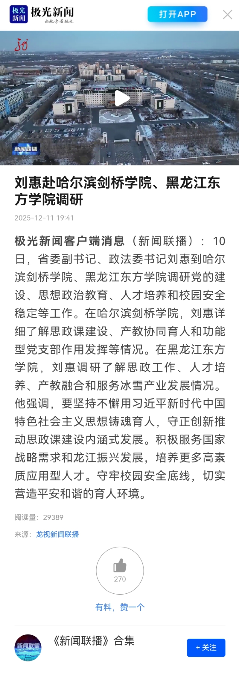 龙视新闻联播、极光新闻:刘惠赴哈尔滨剑桥学院、黑龙江东方学院调研