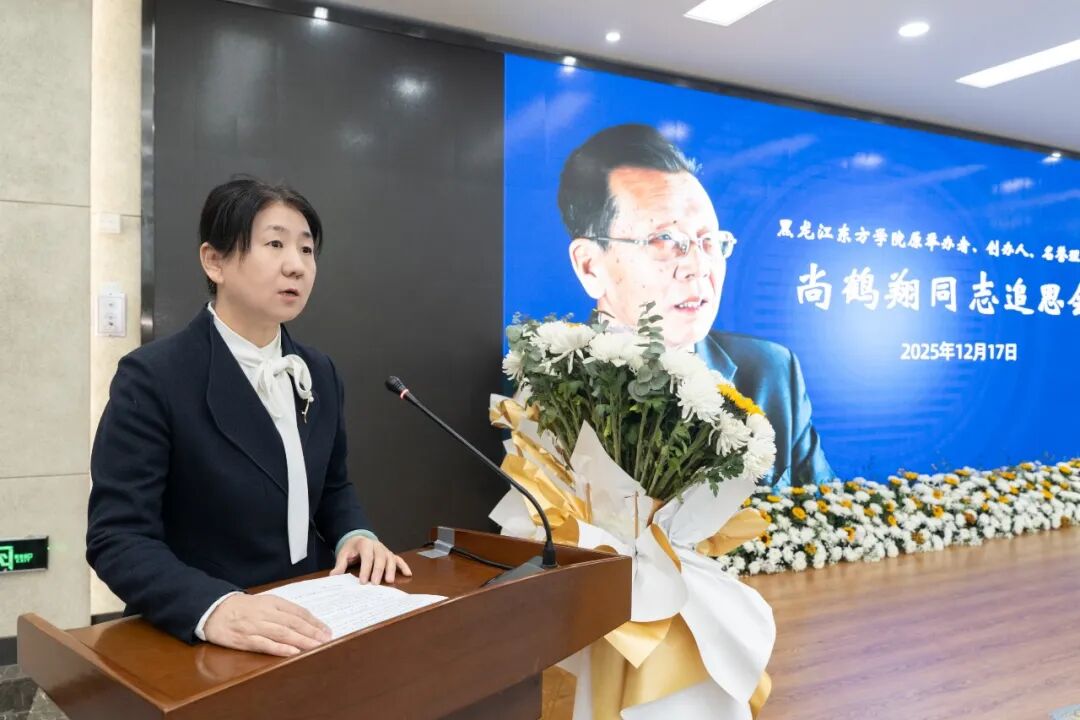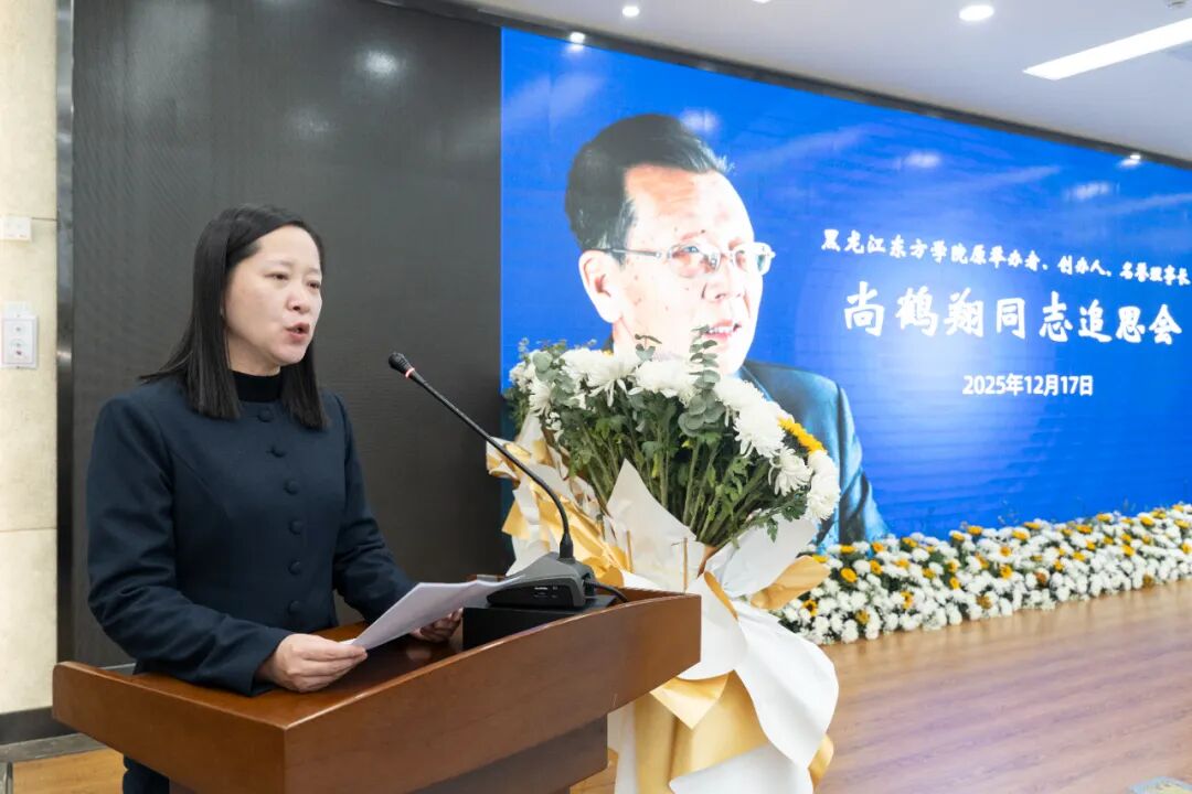 校长徐梅发表讲话。她指出,尚鹤翔同志是一位信仰坚定的共产主义者、一位行为世范的教育家、一位情操高尚的圣贤者。他从黑龙江大学副校长岗位离休后,与孟新、周长源、刘式勤等共同创办了黑龙江东方学院,毕生从事高等教育事业,鞠躬尽瘁,死而后已,以高尚的人格诠释了一名共产党员的崇高精神境界。作为学校的举办人之一,他为了学校的创办和发展呕心沥血,躬身践行教育家的弘道追求,一颗仁爱之心,永昭天地。他乐教爱生、以德化人,在同事、教师和学生中享有极高的威望。他主动放弃举办者权益,将学校举办者由个人无偿的变更为具有政府背景的公益性社会组织——黑龙江省高等教育学会,这一创举为东方学院确立了公有民办的办学属性,从法律上确保了学校的政治安全、财产安全与发展安全,为中国特色民办高校健康发展贡献了可借鉴可复制的“东方方案”。