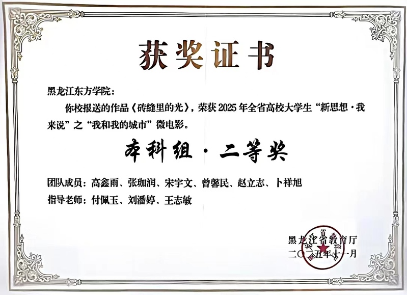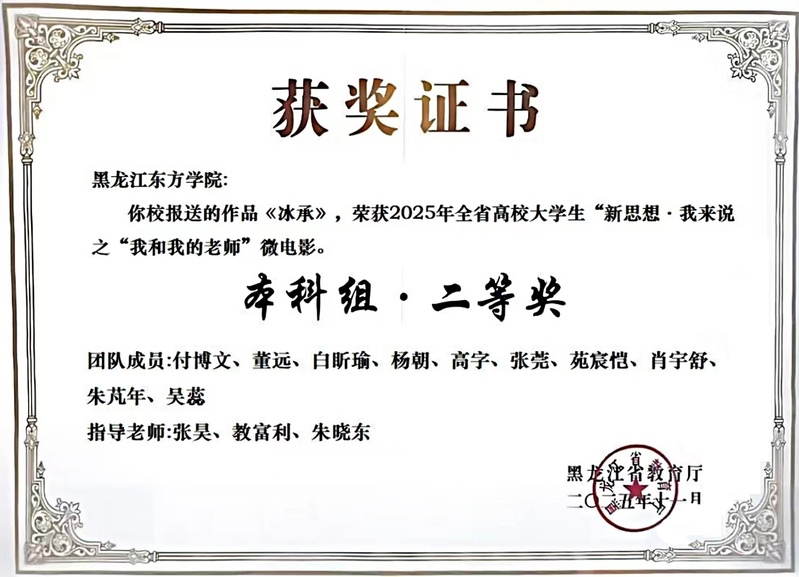 近日,在由黑龙江省教育厅主办的2025年黑龙江省高校大学生“新思想·我来说”主题展示活动中,由我校马克思主义学院申报的微电影作品《砖缝里的光》《冰承》,在精品如云的角逐中脱颖而出,荣获二等奖。